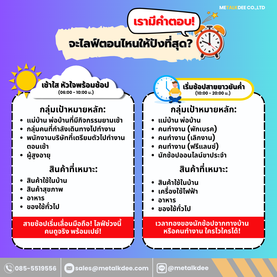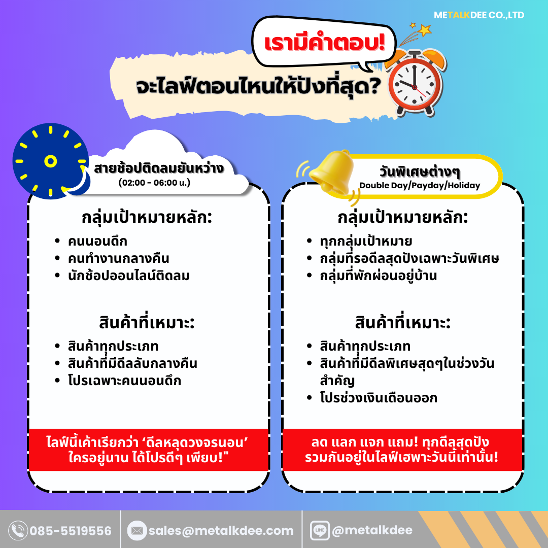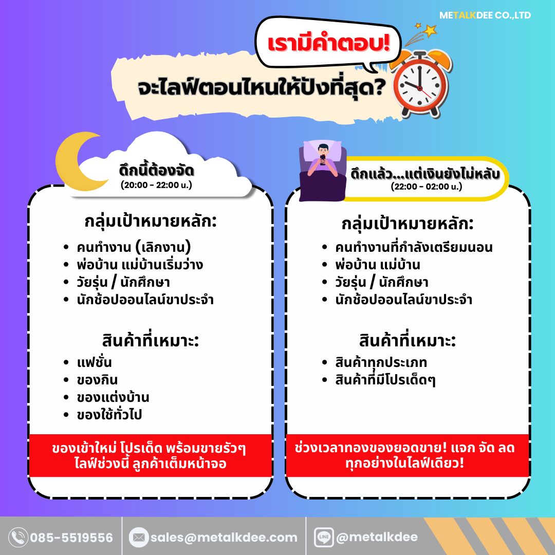 METALKDEE มีคำแนะนำสำหรับช่วงเวลาไลฟ์ที่คนส่วนใหญ่นิยมไลฟ์และสินค้าตามกลุ่มเป้าหมายหลักของคุณ ว่านิยมไลฟ์กันช่วงไหน เพื่อการไลฟ์ขายสินค้าตามเป้าหมายสูงสุดของคุณ